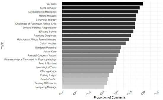 Our final topic model for the autism subreddits included 57 subreddits, 46,914 comments, and 32 unique topics. Second, our parent topic model consisted of 46 subreddits, 27,838 comments, and 22 unique topics. Finally, our behavior therapist topic model consisted of six subreddits, 3163 comments from behavior therapist subreddit members, and 16 unique topics.