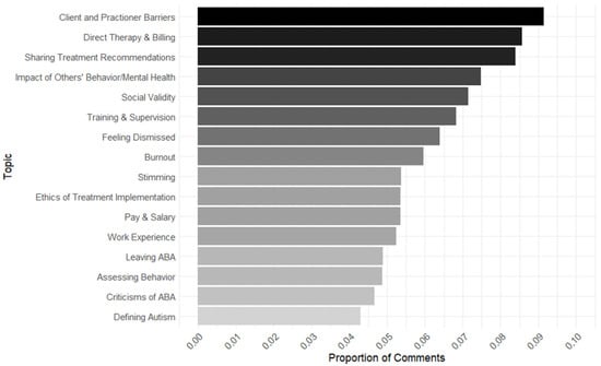 Finally, our behavior therapist topic model consisted of expected topic proportions ranging from 0.04 to 0.09 (Figure 3). The topic that comprised the greatest proportion of comments and had the greatest expected topic proportion for the autism subreddits was “Client and Practitioner Barriers” (expected topic proportion = 0.09). This topic consisted of users discussing various barriers to successful treatment or practice (e.g., cultural/language barriers with parents, a lack of adequate training). The topic that made up the lowest expected topic proportion in the autism model was “Defining Autism” (expected topic proportion = 0.04), which contained conversations about the diagnostic criteria for autism, the neurological bases of autism, and the etiology of autism.