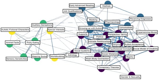 For example, our autism network analysis highlights the need to consider autistic perspectives in developing socially valid support for autistic individuals. We chose to describe the potential implications of conceptualizing special interests characteristic of autism as a signature strength that may be used as a foundation for designing interventions that foster social connection. However, we made this decision at the expense of expounding upon other areas of this network analysis that may be of broader interest to researchers and practitioners. Future researchers may instead wish to perform a similar analysis of the content of discussions within the Gender and Sexuality topic. This may be of key interest because, when compared to the general population, autistic individuals are more likely to be transgender, non-binary, and/or non-heterosexual (Sala et al., 2020). Thus, there may often be reasons to consider factors related to gender and sexuality when designing supports for autistic individuals (e.g., navigating discrimination from multiple angles), making more education, support, and research on this topic a warranted endeavor.