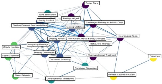 Topic model for autism subreddit group. Note: Nodes (circles) are topics, and edges (i.e., the connections between nodes) indicate a positive correlation. The thicker the edge line, the stronger the correlation between topics.