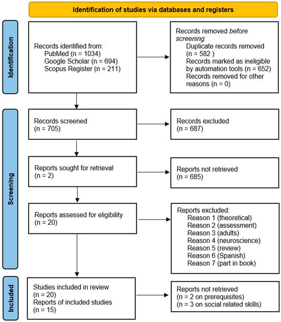 We followed the PRISMA checklist to conduct the review. Regarding the eligibility criteria, the articles were included for the current analysis if they met the following criteria: scientific articles were published in English in peer-reviewed journals; participants were children and adolescents (0–18 years) with a diagnosis of ASD (previously, pervasive disorders), which followed an intervention based on ABA or RFT. Studies involving other clinical populations have been excluded, as well as those that follow no behavioral-analytical interventions, such as CBT (including comprehensive or focused SST), neurodevelopmental, or psychological/psychoeducational training. Similarly, studies were excluded if they focused on narrative reviews, meta-analyses, or commentaries/proceedings. The study employed research designs that adhered to Cochrane’s definitions and criteria for randomized controlled and controlled clinical trials, including post-intervention and case studies (https://handbook-5-1.cochrane.org/chapter_6, accessed 12 December 2023). We reported all studies extracted in a table that contains the following information: ID, journal, DOI, title, abstract, and authors. Successively, two independent researchers (M.E and O.R.) assessed if each study had characteristics of eligibility (Yes/No), labeling motifs of exclusion (e.g., other languages, neuroscience, off-topic, theoretical/narrative, scoping review, systematic review, part in book, assessment, adults, treatment with medications, and correlational analysis, survey, and other clinical conditions), and, after having coded each study independently, counted the agreement (no occurred motifs of disagreement to discuss even if labeled exclusion criteria slightly differently) if such documents were available. Regarding the exclusion of qualitative studies, we aimed to analyze the variables that explain the variance in response to treatment, even if ABA intervention serves as a visual analysis and provides frequencies of mastery of the target. Concerning the information sources, two databases (PubMed and Google Scholar), a register (Scopus), and one reference list (previous reviews) were consulted to identify studies from 1987 to the end of December 2024. The search strategy for databases included the following filters ((theory of mind[Title/Abstract]) AND (autis*[Title/Abstract])) AND (behav*[Title/Abstract]) OR (((false belief[Title/Abstract]) AND (autis*[Title/Abstract])) AND (behav*[Title/Abstract])) OR (((perspective-taking[Title/Abstract]) AND (autis*[Title/Abstract])) AND (behav*[Title/Abstract])) OR (((social cognition[Title/Abstract]) AND (autis*[Title/Abstract])) AND (behav*[Title/Abstract])) and limits (peer reviewed scientific articles and in English). The algorithm was enriched with the following items: “mental state”, “desires”, “irony”, “social behav*”, along with the term “autis*” or “Asperger” in the title and abstract. A register of behavioral journals (e/ISSN) indexed in Scopus Elsevier with related editor (accessed date the end of December 2023) was extracted as follows: Behavior Analyst (07386729; Springer Nature), Behavior Modification (01454455; SAGE), Behavior Research Methods (1554351X; Spring-er Nature), Behavior Therapy (00057894; Elsevier), Behavioral Interventions (10720847; Wiley-Blackwell), Behavioral Sciences (e2076328X; MDPI), Behaviour Change (08134839; Cambridge University Press), Behaviour Research and Therapy (00057967; Elsevier), Beyond Behavior (10742956; SAGE), Cognitive and Behavioral Practice (10777229; Elsevier), Cognitive Behaviour Therapy (16506073; Taylor & Francis), Current Opinion in Behavioral Sciences (23521546; Elsevier), European Journal of Behavior Analysis (e2377729X; Taylor & Francis), Journal of Applied Behavior Analysis (00218855; Wiley-Blackwell), Journal of Behavior Therapy and Experimental Psychiatry (00057916; Elsevier), Journal of Behavioral and Cognitive Therapy (26663473; Elsevier), Journal of Behavioral Education (10530819; Springer Nature), Journal of Behavioral Health Services and Research (10943412, Springer Nature), Journal of Positive Behavior Interventions (10983007, SAGE), Journal of Rational Emotive and Cognitive Behavior Therapy (08949085; Springer Nature), Journal of the Experimental Analysis of Behavior (00225002; Wiley-Blackwell), Journal of Verbal Learning and Verbal Behavior (00225371; Elsevier), Learning and Behavior (15434494; Springer Nature), Perspectives on Behavior Science (25208969; Springer Nature), Progress in behavior modification (0099037X; SAGE), The Journal of applied behavioral science (00218863; SAGE).