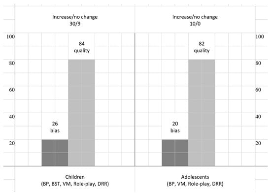 The harvest plot displays the number of increases and no changes, along with the related quality appraisal of studies and methodological bias. Note. Teaching strategies: BP (behavioral package), VM (video modeling), DRR (derived relational responding).