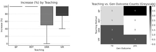 The first boxplot shows ID vs. increase. Both groups with and without ID have similar medians, with values near 100%. There is a slightly broader range in the ID group (some lower values observed, around 40–67%). However, there is no notable difference in performance improvement based on intellectual disability status, consistent with the Mann–Whitney U test result (p = 0.804). The second box displays language skills vs. increase. The verbal group shows a broader spread, including multiple studies at 100%, as well as a few lower outliers. The partial verbal group appears to have slightly less variability but a small sample size. There is no statistically significant difference (p = 0.162), but the greater spread in the verbal group might hint at variability worth monitoring in larger studies. The third box illustrates the relationship between age and increase. Both groups have medians close to 100%. The children show more variability, with several studies achieving 100% and a few falling below; there was no significant difference (p = 0.305). Though adolescents’ results are more consistent (likely due to a smaller sample size), the performance improvements appear broadly similar. The last box shows teaching methods vs. increase, where BP and VM methods show studies predominantly achieving 100% but with occasional lower outcomes (notably in VM and one in BP at 40%). DRR consistently achieved 100%. BST had one study at 100%. Moreover, a series of Fisher’s Exact Tests examined the relationships between study characteristics and the presence of generalization issues. Variables included intellectual disability status (ID), language skill (Lang), age group (Age), and teaching method (Teaching). The results indicated no statistically significant associations for any factor: ID: p = 0.619, Lang: p = 0.569, Age: p = 0.569, Teaching: p = 0.124. Despite the lack of statistical significance, a clear pattern emerged for teaching methods. On the other hand, we performed a statistical test studying the percentage improvement in performance using Mann–Whitney U tests for dichotomous predictors (ID, Lang, Age) and a Kruskal–Wallis H test for the multi-category predictor (Teaching). The results revealed no statistically significant differences (ID: p = 0.804; Lang: p = 0.162; Age: p = 0.305; Teaching: p = 0.503). However, descriptive trends were evident. Additionally, participants classified as verbal and those in the children’s age group exhibited greater variability in performance outcomes, suggesting that these groups might be more sensitive to differences in intervention approaches. The combination of non-parametric statistical tests and visual analytics proved valuable in detecting trends obscured by the modest sample size and limited distribution of study characteristics. Confirmatory studies with larger, more balanced datasets are necessary to substantiate these observations.