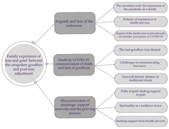 The three identified categories were as follows: (1) Anguish and fear of the unknown; (2) Death by COVID-19: communication of death and lack of goodbyes; and (3) (Re)construction of meanings: support networks and the grieving process.