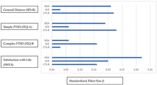 Figure 1 summarizes regression results. It shows the effect size of ND and HD predictions of simple and complex PTSD, general distress, and life satisfaction. Simple PTSD was predicted by ND and the Cumulative Trauma Scale-Revised. Complex PTSD was predicted by ACE, general distress was predicted by ND and the Cumulative Trauma Scale-Revised, but not by ACE. ND, ACE, and the Cumulative Trauma Scale-Revised all predicted satisfaction with life, but satisfaction with life was more strongly predicted by ND histories.