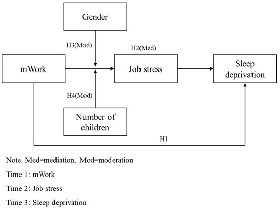 Given these findings, job stress is likely to mediate the relationship between mWork and sleep deprivation. Specifically, job stress acts as a critical mechanism that explains how mWork depletes resources and contributes to sleep deprivation. Therefore, we propose the following hypothesis: