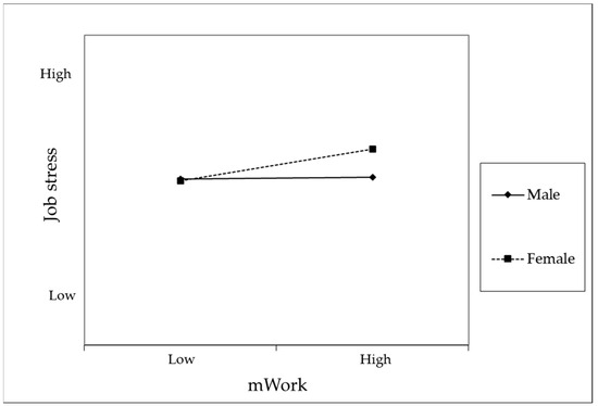 Hypothesis 3 proposed that the relationship between mWork and job stress would be moderated by gender. As shown in Model 3 of Table 3, the interaction term between mWork and gender had a significant effect on job stress. Furthermore, Model 3 demonstrated a significant improvement in explanatory power compared to Model 2. A subsequent simple slope analysis (see Figure 2) revealed that the relationship between mWork and job stress was significant for women but not for men. These findings confirm the presence of a moderating effect of gender.