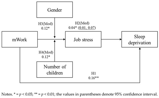 Hierarchical regression models were constructed to test the main and moderating effects proposed in Hypotheses 1, 3, and 4. Model 1 included only the control variables. Model 5 introduced mWork to assess its direct association with job stress and sleep deprivation, thereby addressing Hypothesis 1. Model 3 incorporated interaction terms between mWork and gender, and between mWork and number of children, to assess the moderating roles of these variables as specified in Hypotheses 3 and 4. This modeling approach enables a systematic evaluation of the incremental explanatory power of each predictor and interaction term, providing a clear framework for testing the hypothesized relationships.