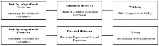 - Van den Broeck, A., Vansteenkiste, M., De Witte, H., Soenens, B., & Lens, W. (2010). Capturing autonomy, competence, and relatedness at work: Construction and initial validation of the Work-related Basic Need Satisfaction scale. Journal of Occupational and Organizational Psychology, 83(4), 981–1002. [Google Scholar] [CrossRef]