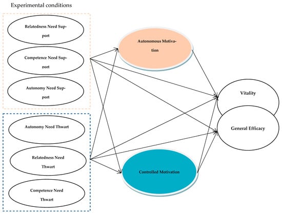 This experimental study synthesizes the H-SDT () and the dual-path framework (; ) under the SDT framework, specifically looking at the dual-path changes in situational motivation and employees’ subjective vitality and perceived general efficacy during a relatively short temporal duration, such as 20–30 min, in online settings. The experimental manipulations encompass all three basic psychological needs (autonomy, competence, and relatedness) through two independent paths (support vs. thwart) in a factorial design (see Figure 2 for the research model of the online study).