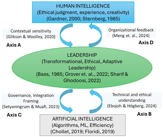The model reflects the following axes of influence: Axis A: From HI to leadership requires contextual sensitivity (; ); Axis B: From AI to leadership—demands technical understanding and ethical vision (; ; ; ; ); Axis C: From leadership to AI—demands governance and an integration framework (); Axis D: From leadership to AI regarding organizational feedback (; ; ; ).