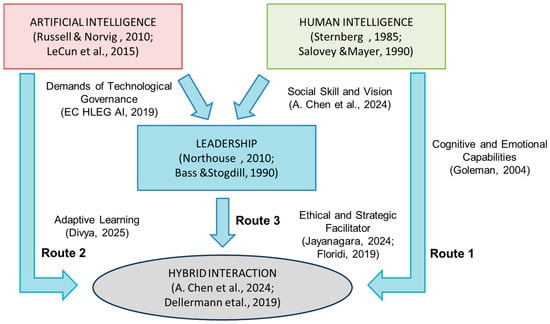 Route 3 from leadership toward hybrid interaction, assuming a role of strategic, ethical, and transformational mediation (; ; ). As shown in Figure 1, this model also considers how leadership can affect both HI (e.g., informative and adaptive settings) and AI (e.g., in terms of governance and ethical orientation). Recent research has emphasized these connections (; ).