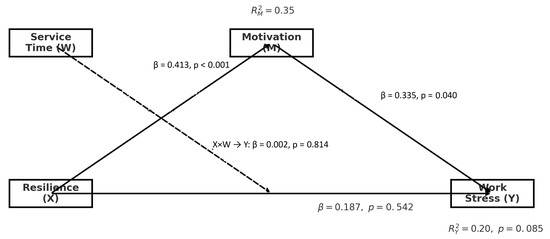 The findings reveal an interesting pattern regarding the relationship between resilience and work stress. While resilience significantly predicted motivation (β = 0.413, p < 0.001), and motivation in turn was significantly associated with reduced work stress (β = 0.335, p = 0.0401), resilience itself did not demonstrate a direct effect on work stress (β = 0.187, p = 0.5420). This finding appears to contradict some previous studies which suggested a direct protective effect of resilience against stress.