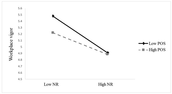 Perceived organizational support moderates the negative relationship between need for recovery (NR) and workplace vigor (WV), such that employees with greater perceived organizational support will experience a weaker negative relationship between NR and WV.
