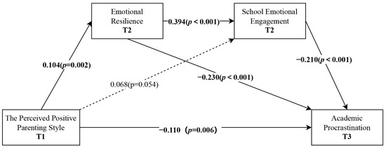 3. Does the perceived positive parenting style indirectly predict academic procrastination via school emotional engagement?