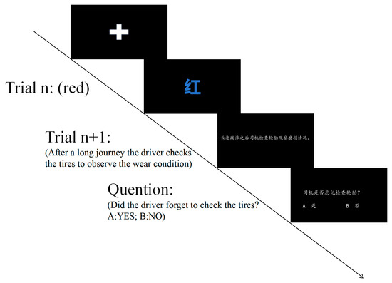 Participants are required to judge the colors of Chinese characters presented on the screen, with the target colors being red, yellow, and green. The experiment consists of 20 congruent trials, in which the meaning of the Chinese characters corresponds with the ink color (e.g., the Chinese character “红 (red)” written in red ink, “黄 (yellow)” in yellow ink, and “绿 (green)” in green ink). Additionally, 20 incongruent trials are included, where the meaning of the Chinese characters does not align with the ink color (e.g., the character “红 (red)” written in yellow ink, “绿 (green)” in red ink, and “黄 (yellow)” in green ink). This setup ensures that the cognitive control mechanisms engaged are identical to those required for the language task (Milham et al., 2001). To further enhance the internal validity of the Stroop task, 20 neutral trials are incorporated, in which the meaning of the Chinese characters bears no relation to the ink color (e.g., the character “玩 (play)” written in red ink or “国 (country)” in green ink). All neutral trials are combined with filler sentences.