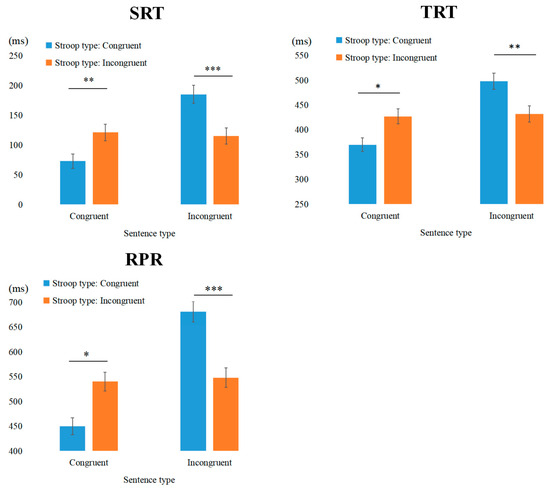 Total Reading Time and Regression Path Reading time: Only the main effect of sentence type of TRT and RPR was found to be significant. Reading times for congruent sentences were significantly shorter than those for incongruent sentences (TRT: b = −0.109, SE = 0.017, t = −6.511, p < 0.001, RPR: b = −0.061, SE = 0.016, t = −3.829, p < 0.001).
