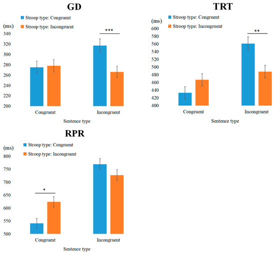 First Fixation Duration and Gaze Duration: Statistical analyses revealed that neither the main effect of sentence type nor the main effect of Stroop type reached statistical significance. Furthermore, the interaction between sentence type and Stroop type was also nonsignificant. These findings indicate that the conflict adaptation effect did not manifest in the measures associated with early-stage response processing.