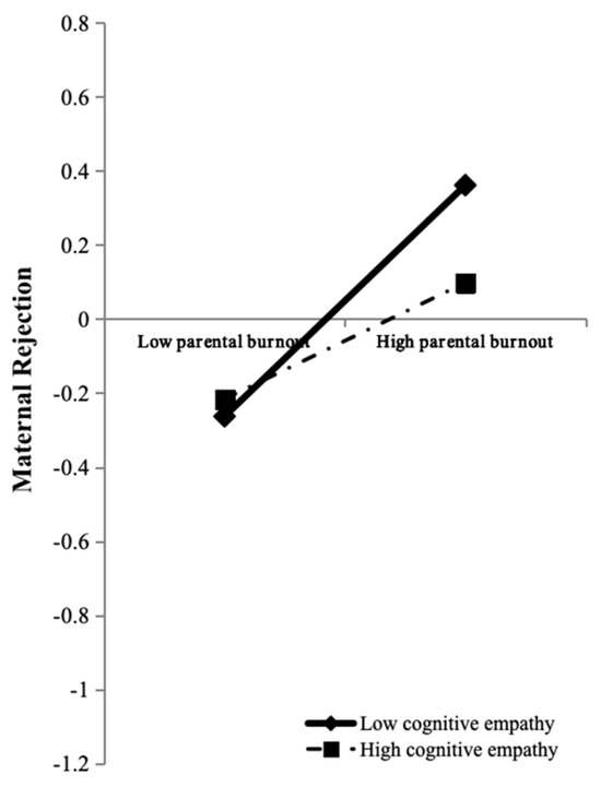 In addition to testing the mediation model, this study examined adolescent empathy as a moderator. The results supported a moderated mediation model, showing that cognitive empathy buffered the indirect link between mothers’ parental burnout and adolescent aggression via perceived maternal rejection. Specifically, parental burnout predicted higher perceived rejection among adolescents low in cognitive empathy, whereas this association was significantly weaker for those with higher cognitive empathy.