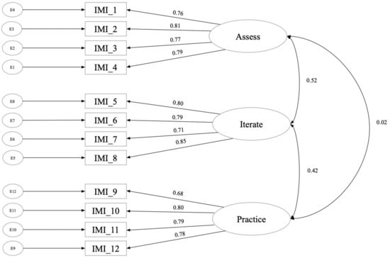 The reliability for the practice factor was α = 0.81 (ω = 0.81), iterate was α = 0.78 (ω = 0.78), and assess was α = 0.85 (ω = 0.85). Practice, iterate, and assess were all highly correlated with the overall Iterative Mindset Inventory (IMI; Table 2), suggesting that an overall measure could also be appropriate depending on theory and relations with other constructs. Theoretically, we conceptualize an Iterative Mindset as an overall construct that captures each of the underlying ideas (α = 0.83; ω = 0.81). We report correlations with both the overall scale and each factor, as this work is exploratory, and such information can inform theory and intervention development.