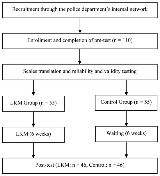 The participants in this study were active-duty police officers from a metropolitan police department in China (Figure 1). Recruitment information was disseminated through the department’s internal communication channels, where the study was described as a stress-relief and self-awareness program aimed at enhancing compassion, mindfulness, and interpersonal skills (Bailey, 2019). A total of 200 active-duty police officers from a metropolitan police department in China were invited to participate in this study. These officers were selected through convenience sampling, using the department’s internal communication channels. Of the 200 invited, 110 officers voluntarily agreed to join, and 92 completed both pre- and post-intervention assessments. The sample was composed of 71.7% males (n = 66) and 28.3% females (n = 26), with an average age of 35.22 years (SD = 3.19).