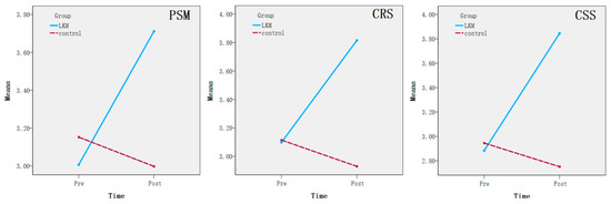 In this study, a two-arm randomized controlled trial design of 2 (Group: LKM, Control) × 2 (Time: Pre, Post) was adopted, and MANOVA was used to examine the different effects of experimental intervention on MAAS, PSM, CRS, and CSS scores of subjects in the two groups. Descriptive statistics of the results are shown in Table 4.