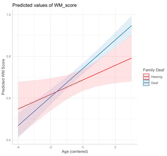 Predicted values of n-back working memory (WM) performance as a function of age, separated by family background (parental hearing status). The shaded areas represent the 95% confidence interval for the slope magnitude.