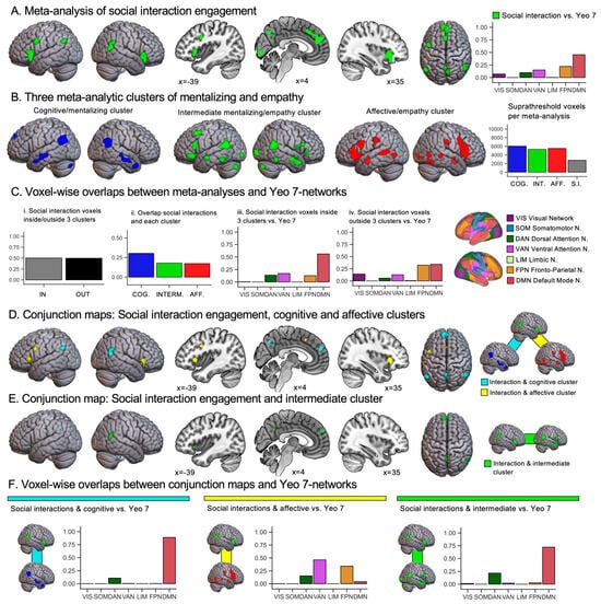 In Figure 2D,E and Table 1, we report the overlaps between meta-analyses. Figure 2D shows overlaps between the social interaction engagement, cognitive/mentalizing cluster and affective/empathy cluster maps. We found overlaps between social interaction engagement and the cognitive/mentalizing cluster in in the bilateral temporoparietal area (angular and posterior middle temporal gyri), medial prefrontal cortex and bilateral precuneus (see Figure 2D). As shown in Figure 2F, these activations were almost entirely located in the brain’s default mode network, and to a small extent also in the dorsal attention network. Overlaps between social interaction engagement and the affective/empathy cluster were found in the bilateral insulae, left inferior frontal gyrus, and left superior frontal gyrus. As shown in a bar chart in Figure 2F, these overlaps were mainly located in the ventral attention, frontoparietal, and dorsal attention networks. In Figure 2E, we show overlaps between social interaction engagement and the intermediate mentalizing/empathy cluster. These overlaps were located in the medial prefrontal cortex, right posterior middle temporal gyrus (i.e., temporoparietal cortex), and left precuneus. Additionally, a small cluster of overlap was found in the left insula. In terms of brain networks, reported in Figure 2F, activations were mainly located in the default mode network and, to a minor extent, also in the dorsal attention network.