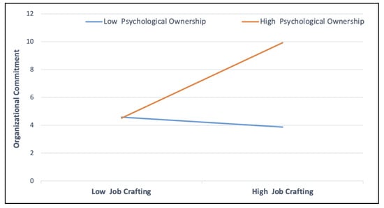 To test Hypothesis 2, interaction terms were included to assess how psychological ownership moderates the relationship between job crafting and organizational commitment. The results indicated a significant moderating effect of psychological ownership (β = 0.17; p < 0.001), suggesting that psychological ownership influences the link between job crafting and organizational commitment. Figure 2 illustrates this interaction effect, showing that the impact of job crafting on organizational commitment strengthens as psychological ownership increases.
