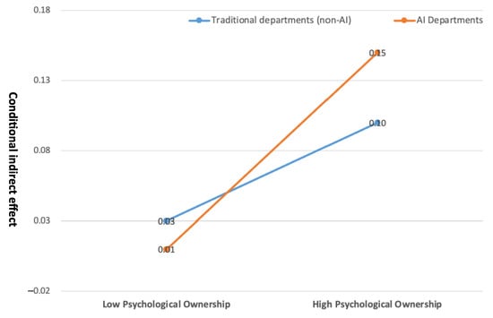 Figure 3 visually illustrates this interaction by comparing outcomes across AI and traditional (non-AI) departments at varying levels of psychological ownership. Psychological ownership was categorized into low and high levels, while department type (AI vs. traditional) served as the second factor. The plotted lines, based on mean values from the analysis, show a clear divergence: at low levels of psychological ownership, the outcome score for the AI department (0.01) was slightly lower than that of the traditional department (0.03). However, at high levels of psychological ownership, the score for the AI department increased markedly to 0.15, surpassing the traditional department’s score of 0.10. These findings suggest that psychological ownership exerts a stronger influence on organizational commitment in AI departments. Notably, employees in AI departments exhibited significantly higher levels of organizational commitment when psychological ownership was high, highlighting its greater motivational impact in technologically intensive environments. In sum, the results confirm that psychological ownership positively moderates the relationship between job crafting and organizational commitment, and that this moderating effect is stronger in AI departments. Hypothesis 2 is therefore supported.