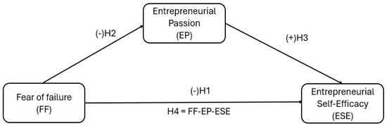 Although research suggests that fear of failure can limit entrepreneurial passion, some studies indicate that self-efficacy can play a mitigating role in overcoming the barrier imposed by fear, thereby generating a positive mindset (Akbari et al., 2024; Boudreaux et al., 2019). In summary, entrepreneurial self-efficacy is a crucial component that empowers entrepreneurs with strength, motivation, commitment, security, and confidence, thereby enhancing their entrepreneurial passion. In other words, by believing in their abilities to face challenges and overcome obstacles, entrepreneurs feel empowered to pursue their entrepreneurial goals effectively, generating entrepreneurial passion and reducing their fear of failure. In addition, previous studies have reported that fear of failure hurts entrepreneurial self-efficacy; that is, students who fear failure tend to have less confidence in their entrepreneurial skills and therefore their self-efficacy is low; In contrast, when a student is passionate about entrepreneurship, he/she consolidates his/her skills better (Makhitha, 2024; Neneh, 2022). In this context, the following hypothesis is proposed: