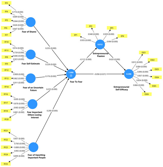 Entrepreneurial Passion, with an R2 of 0.012 shown in the blue circle, is measured by four indicators (EP1–EP4) with very high factor loadings (0.904–0.948). This variable has a significant influence on Entrepreneurial Self-Efficacy, with a coefficient of 0.620 (p = 0.000). The effect size (f2) for this relationship is 0.629, indicating a significant effect according to Cohen’s criteria (f2 ≥ 0.35 for substantial effects). Entrepreneurial Self-Efficacy, with an R2 of 0.396, as noted in the blue circle, is measured by six indicators (ESE1–ESE6) with factor loadings ranging from 0.813 to 0.896. The effect size analysis reveals that Fear of Failure has a negligible effect on both Entrepreneurial Passion (f2 = 0.013) and Entrepreneurial Self-Efficacy (f2 = 0.005), suggesting that while statistically significant, the practical significance of fear of failure as a predictor is limited compared to the substantial influence of entrepreneurial passion on self-efficacy.