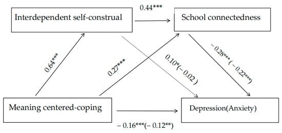 The findings from the descriptive statistical analysis and correlation analysis are summarized in Table 1. These results show that meaning-centered coping, interdependent self-construal, and school connectedness are significantly and negatively correlated with mental health (anxiety and depression) (r = −0.18~−0.31, p < 0.01). Additionally, there is a strong positive correlation between meaning-centered coping, interdependent self-construal, and school connectedness (r = 0.56~0.65, p < 0.01).