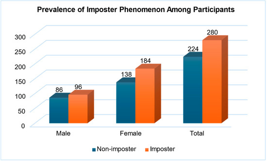Prevalence of imposter phenomenon among participants (n = 504). Note: The total sample size was n = 504. The 95% confidence interval (CI) for the proportion of participants experiencing imposter syndrome was calculated using the standard binomial formula (95% CI: 51.67–60.33%). The cutoff score value of ≥62 differentiates imposter from non-imposter.