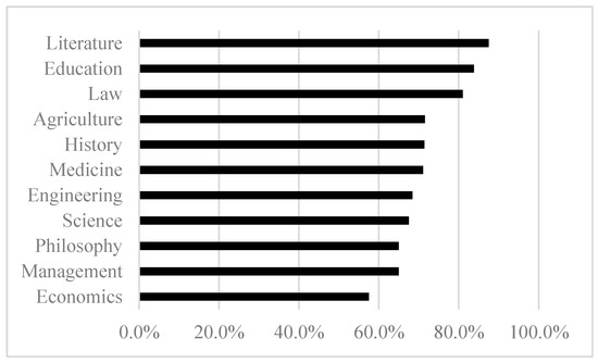 Different academic disciplines have unique knowledge attributes and research paradigms, leading to varying patterns of research development and talent cultivation (Gu & Lin, 2011). As shown in Figure 1, doctoral students’ willingness to pursue research-related careers differs significantly across disciplines, ranging from less than 60% to nearly 90%. Specifically, fields like Literature (87.5%), Education (83.8%), and Law (81.0%) exhibit the highest levels of academic career intentions, all exceeding 80%. The second tier includes disciplines such as Agriculture (71.5%), History (71.4%), Medicine (71.1%), Engineering (68.4%), and Science (67.5%). The third tier, consists of Philosophy (65.0%), Management (65.0%), and Economics (57.5%).