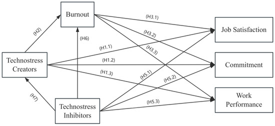 These associations highlight that burnout is not merely an individual health concern but a systemic organizational issue with implications for performance and retention in educational institutions. Burnout not only functions as a negative outcome of stressful work environments but also as a mediating mechanism linking stress to psychological dysfunction. For instance, a study examines the relationship between job stress, job burnout, JS, and organizational CM among university teachers in China, which found that job stress can positively predict organizational CM, and the independent mediating effect of job burnout is significantly greater than JS (P. Wang et al., 2020). Notably, these relationships have seldom been detected in the context of technostress. We hypothesize the following: