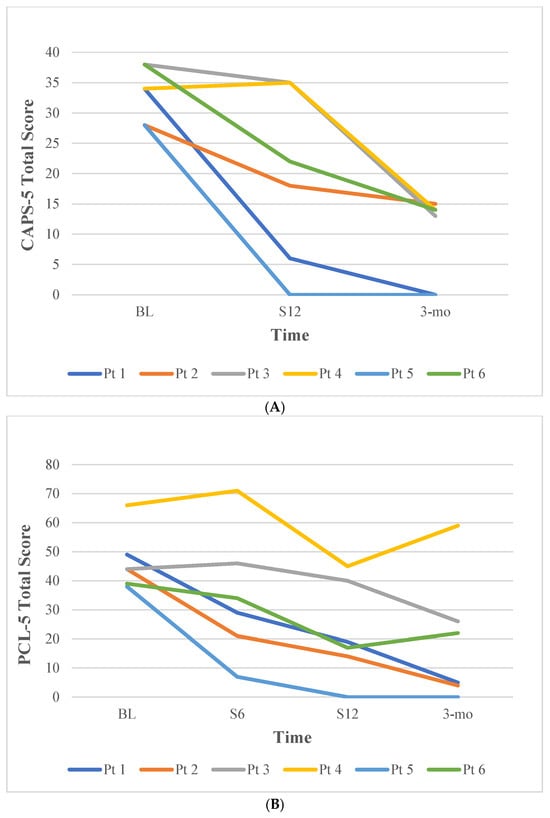 Change Over Time in PTSD Symptoms for Individual Participants. Note. (A) Change in CAPS-5 total scores. (B) Change in PCL-5 total scores. Pt = participant. BL = baseline; S6 = session 6; S12 = session 12; 3-mo = 3-month follow-up.