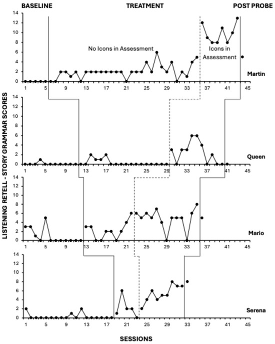 Prior to intervention, all participants had low levels of NLM Listening retell scores, as they were unable to retell stories in a coherent and cohesive manner. As seen in Figure 1, following the introduction of the Story Champs intervention, there was generally an immediate change in both data level and trend, but increases were moderate. When participants used the story grammar icons during the assessment sessions, there was a medium-to-large increase in average retell scores, indicating a meaningful improvement in the completeness of their story retells. However, when the post-probe was conducted without icons in the assessment (i.e., far-transfer context), only Serena maintained her gains completely, Martin and Mario partially maintained their gains, and Queen’s retell score returned to baseline levels. We describe each participant’s listening comprehension performance across baseline and treatment conditions below.