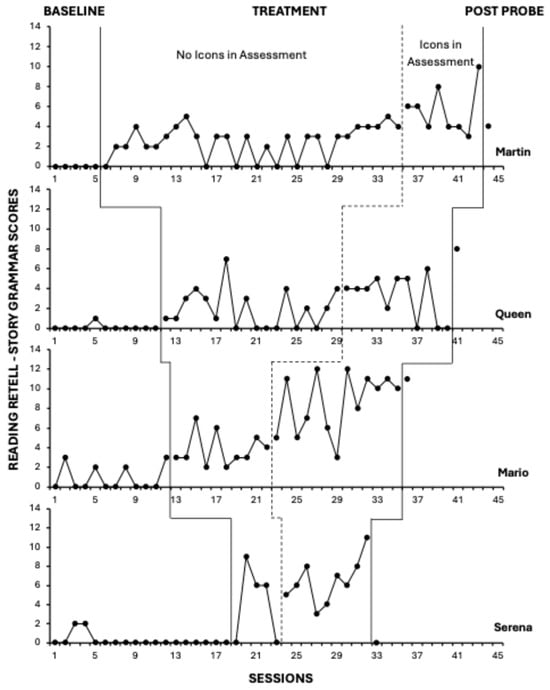 For three out of the four participants, NLM Reading Retell scores occurred at near-zero levels during baseline, indicating poor comprehension of stories read. However, across both the no-icon and icons-in-assessment treatment phases, there was an increase in level for all participants. Further, as shown in Figure 2, most participants immediately or gradually improved upon their retell scores when the story grammar icon strategy was available in the assessments. NLM Reading Retell post-probe data (collected without use of the icons) indicate complete maintenance of treatment gains for Queen and Mario. Martin partially maintained his treatment gains at post-probe. Nonetheless, his post-probe score was substantially above his baseline levels. Only Serena’s reading comprehension performance returned to baseline levels once the icons were removed from the assessment. Participant-specific reading comprehension outcomes are described in greater detail below.