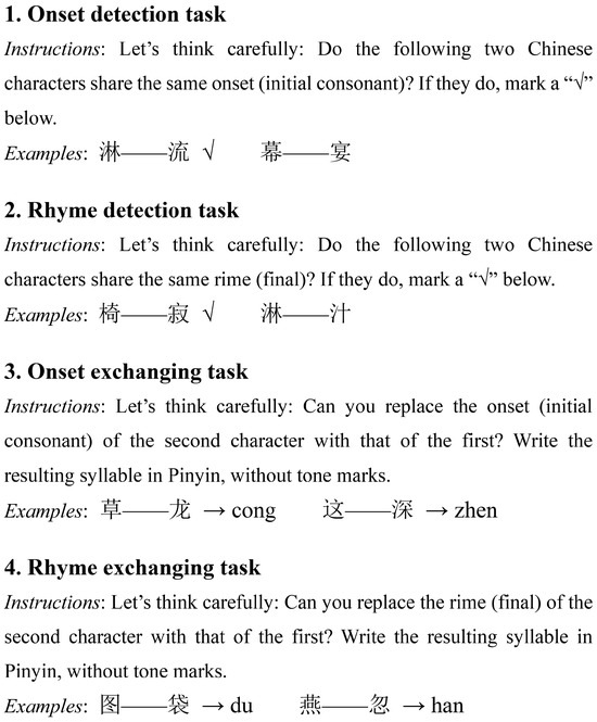 Sample items from four phonological processing tasks. Notes: All items were administered in Mandarin Chinese. English instructions were translated from the original Chinese used during testing.