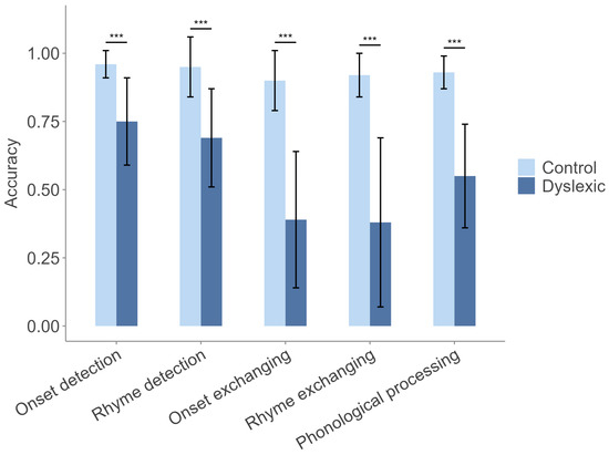 Comparison of reading ability between the dyslexic and control groups. Notes: *** p < 0.001.