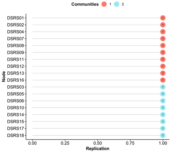 To explore the underlying structure of depressive symptoms in Chinese school-age children, Exploratory Graph Analysis (EGA) was applied to the DSRS. EGA identified two dimensions (Figure 4): Low Positive Affect (items DSRS01, DSRS02, DSRS04, DSRS07, DSRS08, DSRS09, DSRS11, DSRS12, DSRS13, and DSRS16) and Negative Affect (items DSRS03, DSRS05, DSRS06, DSRS10, DSRS14, DSRS15, DSRS17, and DSRS18). In the network visualization, nodes represent the 18 items of the scale, green edges denote positive associations, red edges represent negative associations, and edge thickness reflects association strength. Bootstrap analyses of EGA revealed highly stable results, with both dimensions consistently detected at a frequency of 1.000. Each item was exclusively assigned to its respective dimension with a frequency of 1.000 (Figure 5), and structural consistency was perfect (1.000), indicating excellent performance.