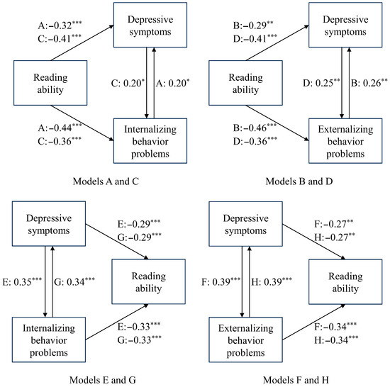 Mediation analyses of reading ability and mental health. Notes: The regression coefficients were given to the antecedent variables in Models A–H. Models A and C: Depressive symptoms and internalizing behavior problems served as mutual mediators of the effects of reading ability on each other; models B and D: depressive symptoms and externalizing behavior problems served as mutual mediators of the effects of reading ability on each other; models E and G: depressive symptoms and internalizing behavior problems served as mutual mediators of each other’s effects on reading ability; models F and H: depressive symptoms and externalizing behavior problems served as mutual mediators of each other’s effects on reading ability. * p < 0.05, ** p < 0.01, *** p < 0.001.