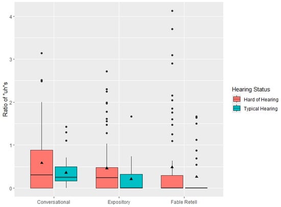 Boxplots of conversational samples (left), expository discourse (middle), and fable retell (right) filled pause uh rates as a function of hearing status. The central lines represent the median values, the filled triangles within the boxplots represent the mean values, and the box limits are the 25th and 75th percentiles. The filled circles outside the box plots represent outliers.