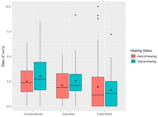 Figure 1 displays box plots for the uh ratios in the three language contexts separated by hearing status. As seen in Table 1 and Figure 1, the means and medians for uh ratios in the CHH are higher than the CTH, across all language discourse contexts. Across both CHH and CTH, the mean and median uh ratios are higher in the conversational samples than the expository discourse. Figure 2 displays box plots for um ratios, which illustrates the higher mean and median ratios in the conversational language samples relative to the expository discourse or fable retells for both the CHH and CTH. Although the box plots appear to show a trend in which the mean and median um ratios are higher for the CTH than the CHH in the conversational and expository discourse contexts, the statistical analysis did not indicate a significant difference between groups.