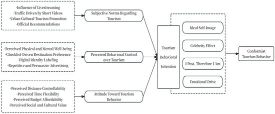 The media landscape constitutes a socially unified entity mediated through imagery (). As a mimetic representation of social mobility, the digital media landscape synthesizes visual information into aggregated digital representations, occupying visual space and consequently shaping tourists’ latent perceptions and preconditioning their individual information choices (). The Theory of Planned Behavior (TPB), developed by Ajzen as an extension of the Theory of Reasoned Action (), serves as a framework for explaining and predicting individuals’ behavioral intentions (). This theory is employed to explain and predict individuals’ behavioral intentions and comprises five key influencing factors: attitude toward the behavior, subjective norm, perceived behavioral control, behavioral intention, and actual behavior (). The attitude toward a behavior is primarily based on an individual’s beliefs about the outcomes of the behavior and the evaluation of those outcomes. The effects generated by digital media landscapes serve as a guiding force, influencing individuals’ behavioral attitudes (). Through platform algorithms, digital media landscapes cultivate audiences’ perceptions of subjective norms. Moreover, networked information sharing and “life-posting” behaviors within peer groups influence individuals’ behavioral intentions (). This process generates social or self-expectations, thereby altering individual intentions (). With the widespread diffusion of internet information in China, individual travel competence has become a fundamental form of behavioral literacy (). In addition to being influenced by close friends and family, individuals’ travel intentions are most strongly shaped by digital media landscapes (). With the advent of China’s influencer economy and traffic-driven economy in the era of mass digitalization, electronic word-of-mouth (EWOM) has emerged as a perceptible external environment that facilitates communicative behaviors (). This process gradually converts individual visual experiences into interactive practices within digital media landscapes, consequently leading to significant convergence in tourists’ perceptions, attitudes, behaviors, and habits (). “Location tagging” and “spark a desire” behaviors serve as effective means for tourists to mitigate safety concerns, assess consumption levels, and reduce travel resistance, thereby reinforcing their behavioral intentions toward group-based decision-making. Among these factors, evaluations and shared experiences from same-age and same-gender groups on authoritative information platforms generate a peer effect, driving tourists to conform to the crowd through interactive support and competitive self-display () and engage in the social practices of self-presentation, self-perception, and identity construction.