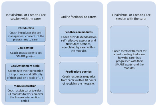The CareCoach programme is described in detail elsewhere (Fox et al., 2021). Briefly, CareCoach is an 8-week self-management programme comprising three core components: (1) two virtual sessions with a personal coach at the start and end of the intervention to introduce the intervention to carers, assist them to choose relevant modules and set SMART goal(s) to complete the Goal Attainment Scale (GAS) (Jennings et al., 2018) (each goal rated by the carer on a scale of 1–3), review progress and discuss next steps; (2) an online platform giving carers access to nine learning modules, from which carers choose the four most relevant to their situation; (3) online feedback from a coach using the online message function on the online platform throughout the intervention period. A summary of intervention delivery process and work done by coaches during the intervention period is detailed in Figure 1.