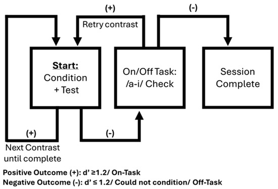 Figure 1 demonstrates the testing protocol used. If the child reached criterion on the first contrast, the tester would then move to conditioning and subsequent testing of the second contrast. This would continue until all contrasts were completed or criterion was not reached on a contrast. The vowel /a-i/ contrast was used to assess on/off-task orientation only if criterion was not met on a contrast in the best listening condition (aided for the CHH cohort). If the child had previously reached criterion on a contrast, the tester looked for two independent consecutive responses for the /a-i/ contrast and determined the child as on-task before continuing with the protocol. If the child had not previously met the criterion on a contrast, a full test of /a-i/ was completed, and the protocol was resumed if the child met criterion (d′ ≥ 1.2) and was therefore considered to be on-task. If the child failed to demonstrate two independent consecutive responses or did not meet criteria for a full test of /a-i/, they were determined to be off-task, that session was discontinued and a subsequent session was scheduled. Each contrast (/ba-da/ and /sa-ʃa/) in the best listening condition could be tested up to two times in a single session should criterion not be met upon the first test.