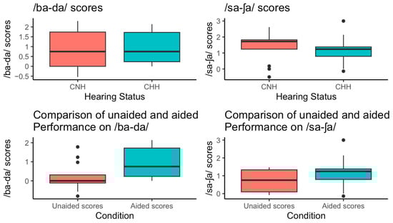 No significant group differences were observed when comparing aided CHH and CNH for performance on /ba-da/ (W = 98.5, p = 0.81). When comparing performance between groups for the /sa-ʃa/ contrast, scores differed significantly between CNH and aided CHH (after removing one outlier) as indicated by Wilcoxon rank-sum test (W = 151, p = 0.04). Specifically, aided CHH had a lower median of 1.19 when excluding the outlier, compared to a higher median of 1.24 when the outlier was included, and a median of 1.72 for CNH participants. Note, following visualization of the distribution of scores for CHH and using boxplots, the /sa-ʃa/ outlier was removed due to its value being 1.5 times the interquartile range of the third quartile.