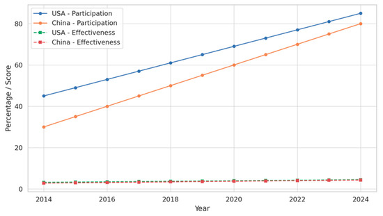 The increasing participation rates and the increasing confidence of teachers in the efficacy of online programs are both indicative of the growth of teacher professional development (TPD) in the digital age. Based on the well-structured dataset generated as part of the methodology, this section offers a comparative analysis of perceived efficacy and involvement in the United States and China from 2014 to 2024. By 2024, 85% of teachers in the United States participated in online teacher professional development (TPD), a significant increase from the 45% who did so in 2014. District-level innovations that have enabled digital professional learning options, sustained governmental support, and infrastructure investments are the reasons for this heightened tendency. In contrast, China’s participation rate was 30% in 2014, but it increased significantly, ultimately reaching 75% by 2024. The faster development curve of China is associated with large-scale centralized changes that were implemented after 2018, such as the Smart Education of China project, which rapidly expanded national platforms for teacher training.